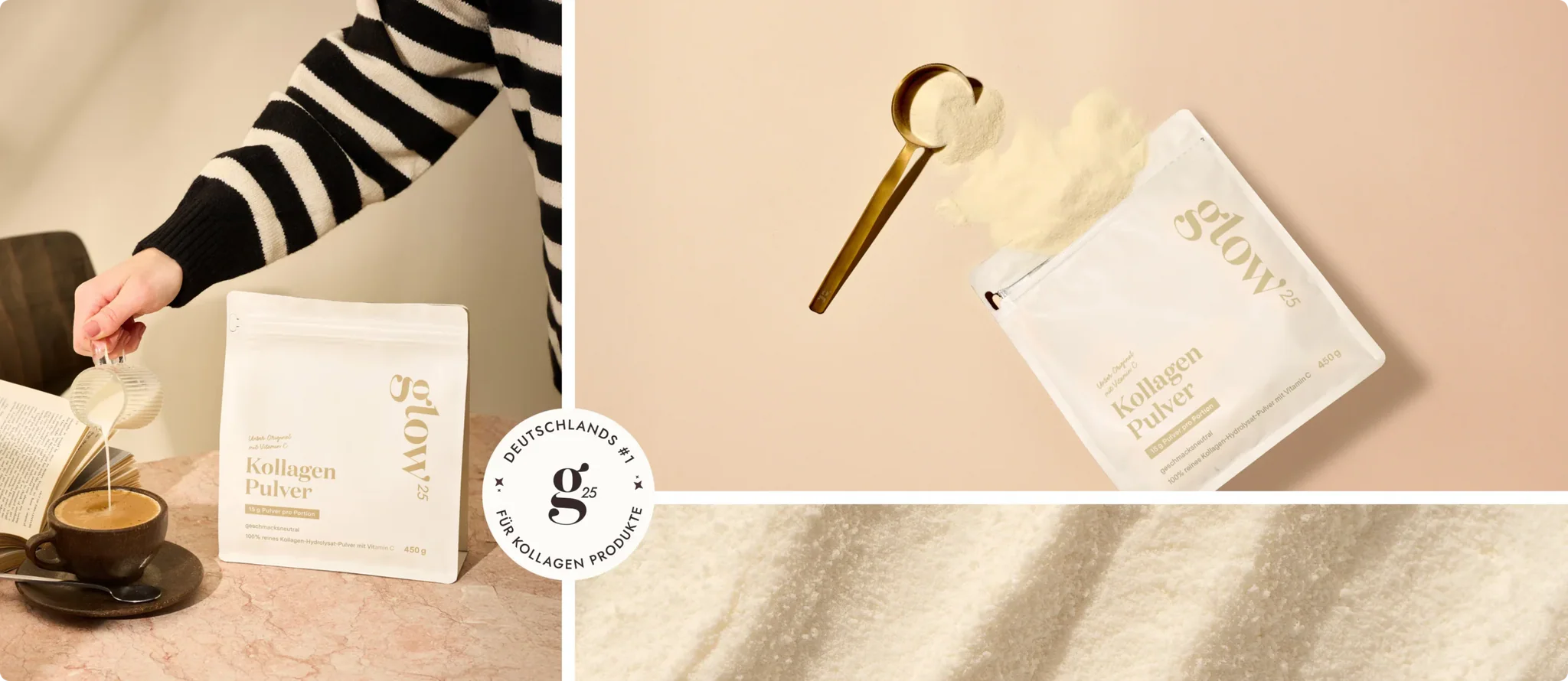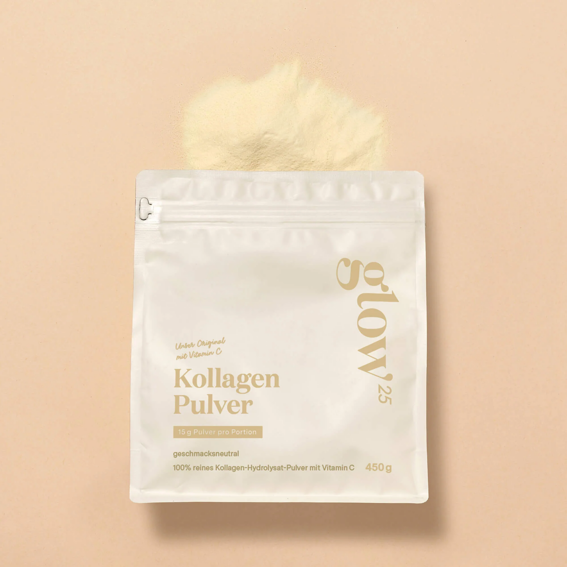 Wenn du ein Produkt ohne Zusätze bevorzugst ist unser Glow25 Marine Kollagen Pulver die perfekte Wahl. Es besteht zu 100 % aus reinem Kollagenhydrolysat, welches aus Fischhäuten gewonnen wird.